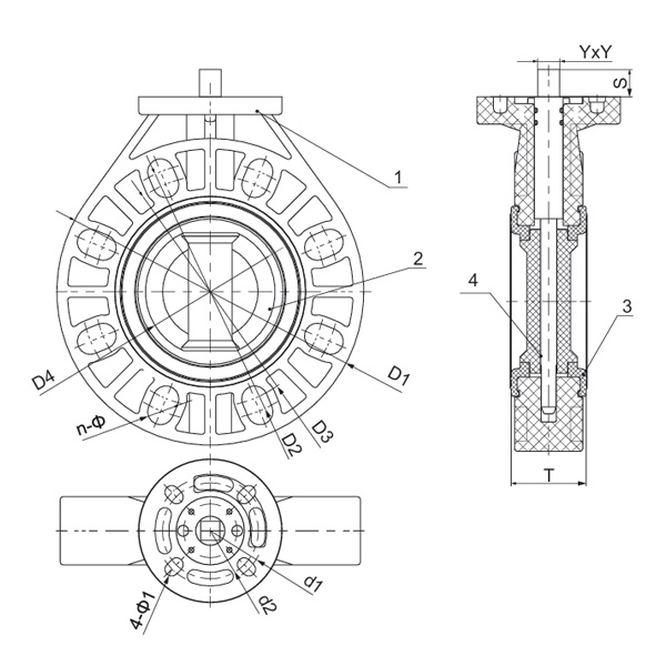 Specifikacija D1 (mm) D2 (mm) D3 (mm) D4 (mm) T (mm) n-Φ (mm) YxY (mm) S (mm) d1 (mm) d2 (mm) 4-Φ1 (mm)